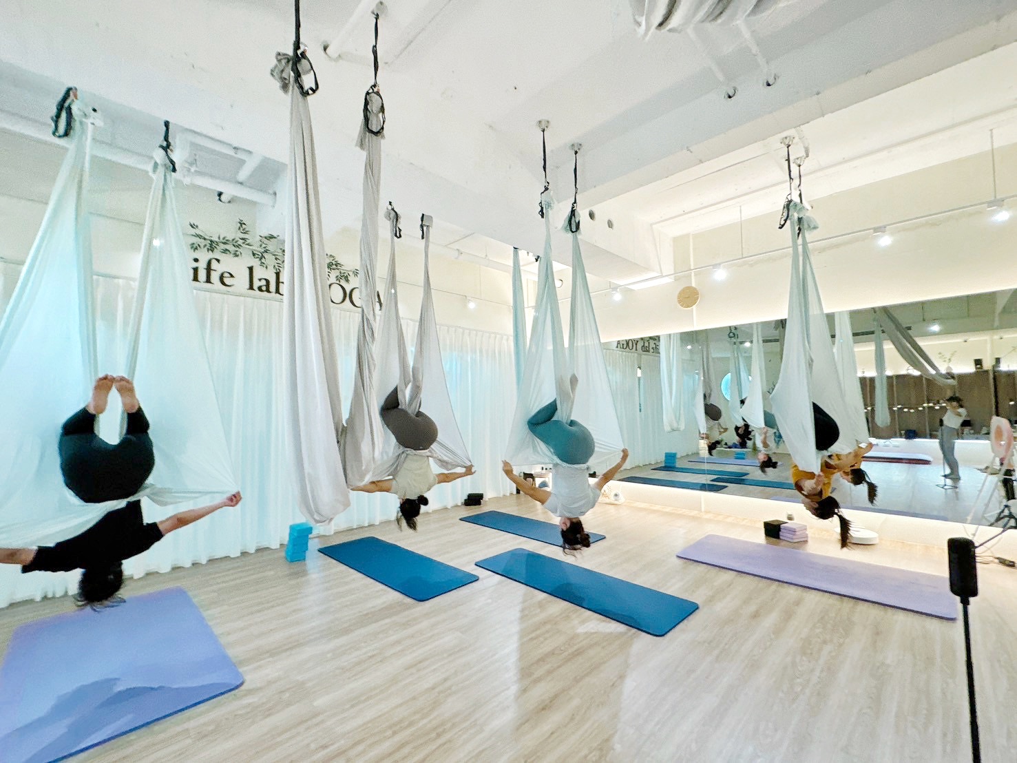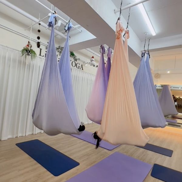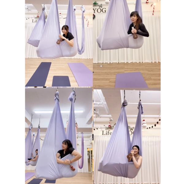 空中瑜珈除了體能鍛鍊,也強調呼吸與意識的連結,在空中穩定地呼吸與延展,幫助釋放壓力、放鬆身心。